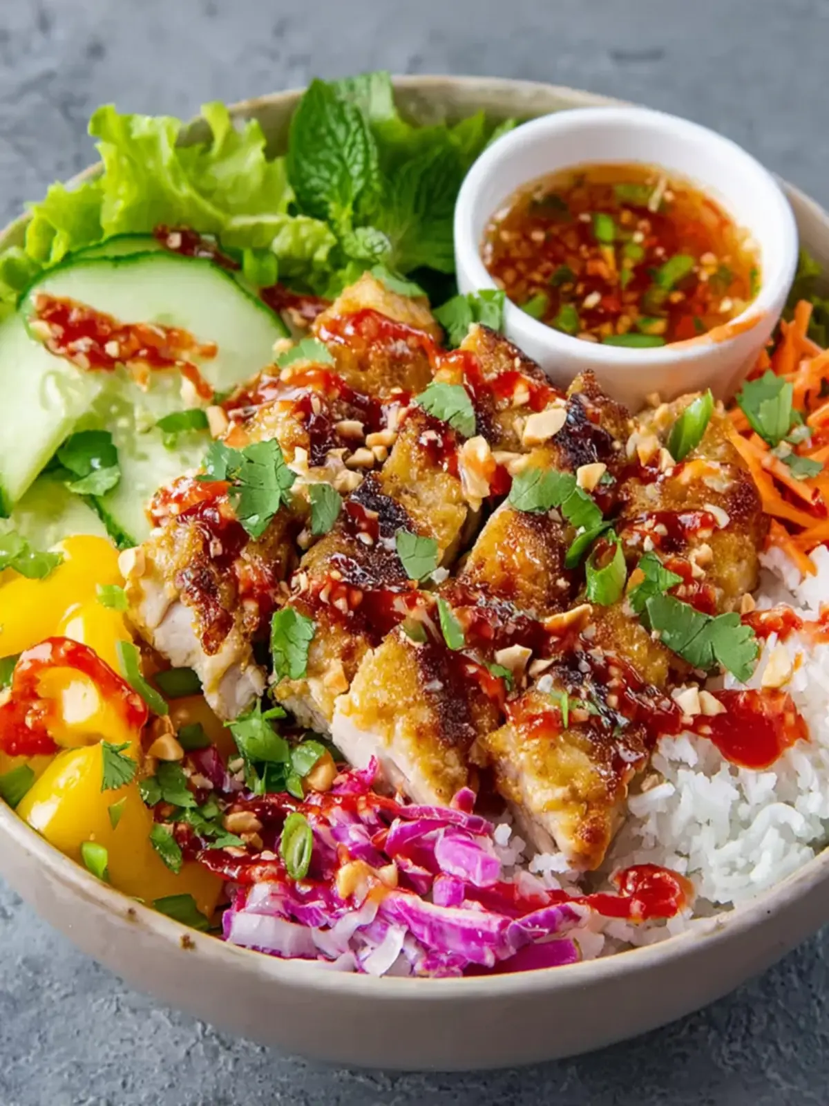 - Colorful Ingredients: Each component—from bright green cucumber slices to the golden chicken strips—contributes to a rainbow of colors, making your bowl as appealing to the eye as it is to the palate.