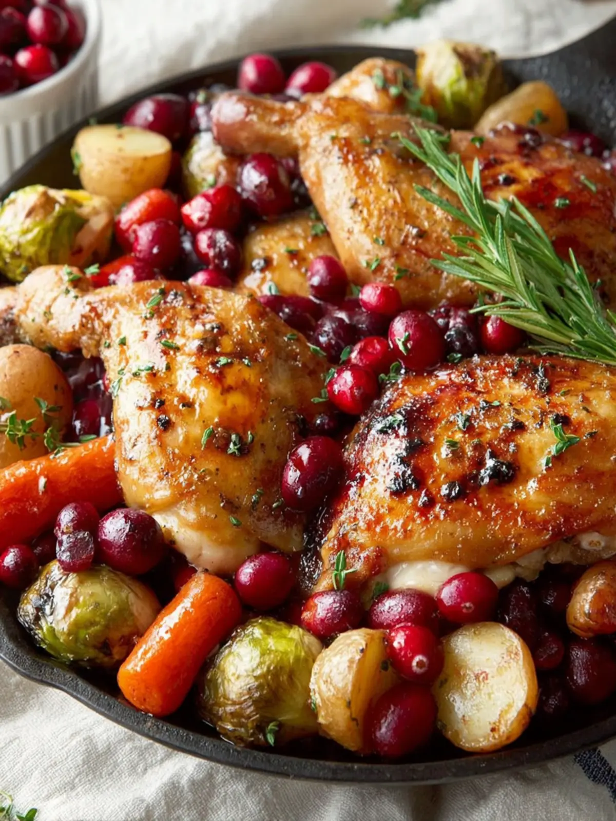 Chicken: I opt for bone-in, skin-on chicken thighs because they remain juicy and flavorful during roasting. Their rich taste marries beautifully with the tartness of the cranberries, making each bite a delight.
