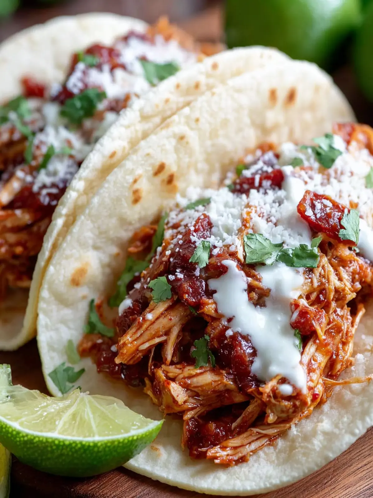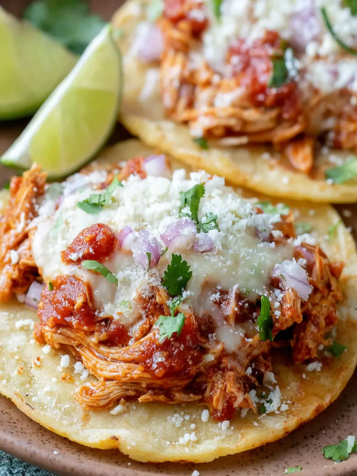 A flavorful chicken tinga recipe served in tortillas, garnished with cilantro, cotija cheese, and lime juice.