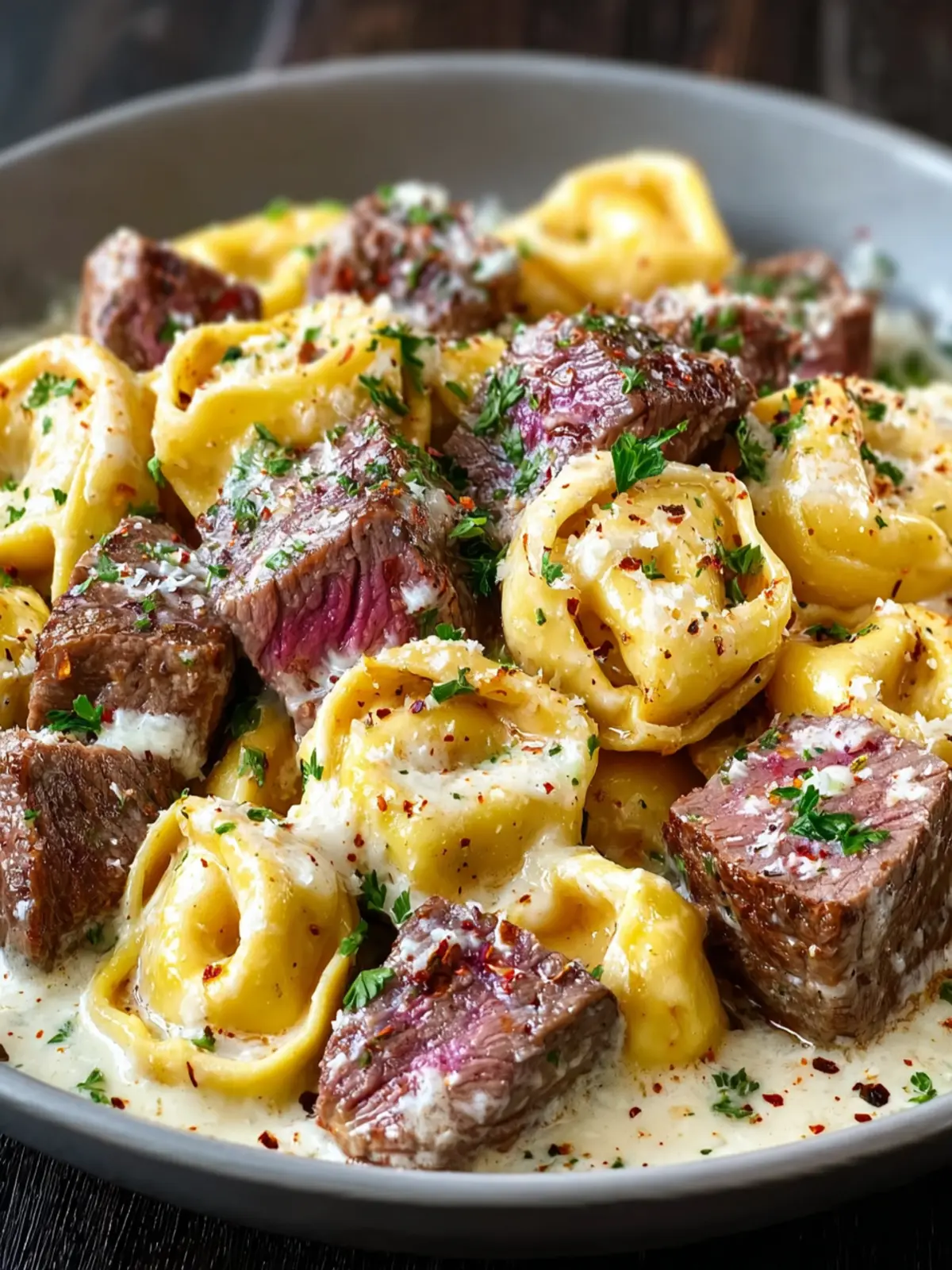 - Fold in the cooked tortellini and sliced steak until well coated with the sauce.