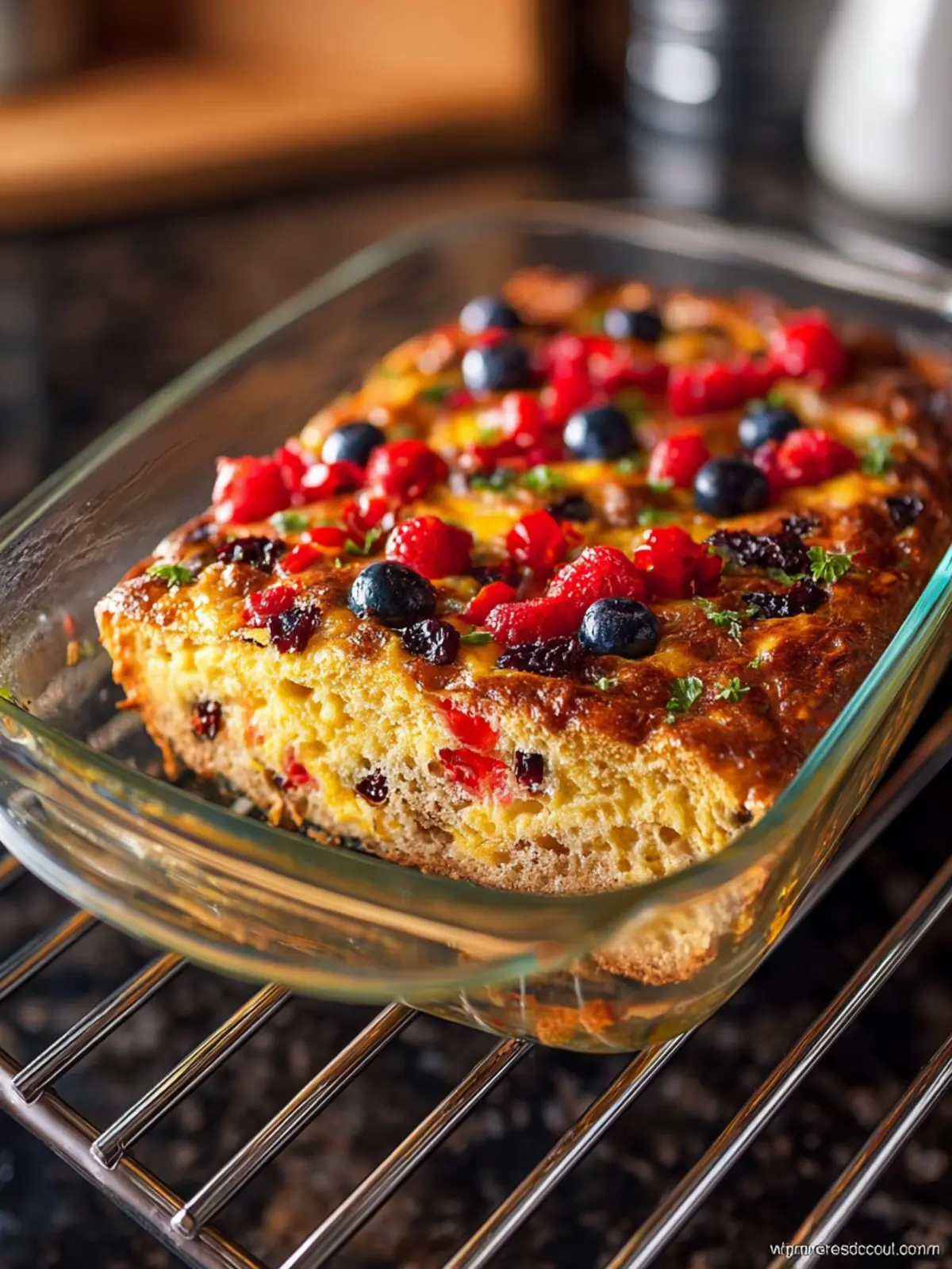 This breakfast casserole is a delicious and nutritious way to start your day, combining eggs, whole grain bread, and fresh vegetables.